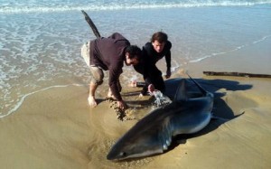 The pair used pieces of wood found on the beach to try to lever the shark out of the sand and into deeper water and also tried pulling it out to sea “inch by inch”, always fearful that the predator would attack them if it had a chance.