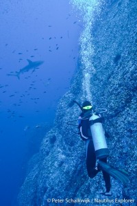 This morning we were escorted toward San Benedicto Island by a huge pod of leaping Bottlenose Dolphins. Some of the jumps were easily 15 feet into the air. The Captain said he was looking one in the eye as he stood on the bridge. The beautiful Baja sunrise lit up the impressive volcanic island as we arrived at the Canyon. All the divers were super excited as we dropped the anchor and set the lines. Just under the boat, we dropped onto a nice pinnacle that lies just off the ridge that makes up the canyon wall. We found several White Tip Reef Sharks lounging on the bottom under a ledge. A few divers went out to the cleaning stations and were able to see one of the famous Hammer Head Sharks come in to check out the reef. The viz down toward the bottom was not a good as in the shallows, so the shark had to get quite close for a good look.