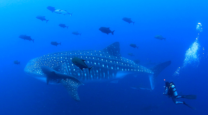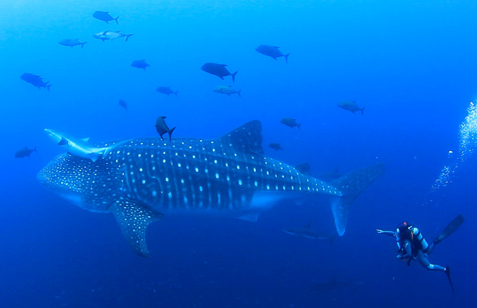We arrived to find a lone humpback whale swimming by, showing us its tail as it dove deep. One of my favorite sayings, and one I wish I followed more, is ‘Slow is smooth, smooth is fast’ and today was the perfect example of this. Everyone was on their game as we loaded the inflatables with divers on the backdeck and headed for the dive spot. Crew and passengers were like a well-oiled machine operating with precision. And what did we get in return? Sharks!!!! Loads of sharks! All sorts of sharks! And to cap the triumph…a whale shark! I am thrilled when the guests return talking about such a treat, but today was different – the whale shark was there for 2 whole dives! Everyone saw it and the amazing videography of this beautiful creature is evidence. Visibility was outstanding despite the sun hiding behind the clouds for most of the day. It was almost enough to forget about the huge Galopogos sharks, the massive tuna schools and the giant hammerhead on the scene today. It was an incredible afternoon for everyone has smiling face after smiling face returned with photos, video and memories stored away. We have another day here at Roca, and I have my fingers crossed.
