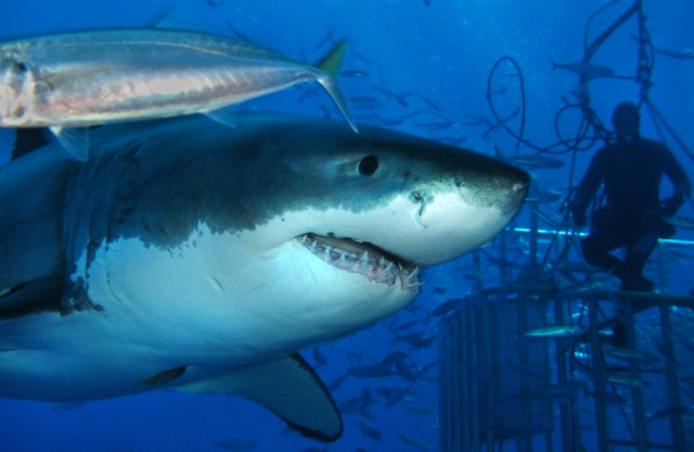 This morning the sun peeks through clouds as the crew gathers on the back deck to lower cages into the blue in preparation for another day of throwing ourselves and guests into the shark infested waters off Guadalupe Island. After a quick breakfast the first group suits up in a medley of neoprene and gingerly lowers themselves into the cool water. It‚s a promising start, with two great white sharks vying for our attention;, circling, planing high towards the surface and back down into the depths. Their movements are silky, each swish of the tail precise and economical. They are beautiful as they cruise by, showcasing the scars and markings that allow us to identify them. I have dived with white sharks in the past, but it was nothing like this. In South Africa, the sharks appear from a murky soup; they are aggressive and frustrated after being drawn in by bait that is literally yanked from their mouths. At Guadalupe, we can see individual links in the anchor chain, one hundred feet away from the cages. The sharks silently circle us, their curiosity evident as they glide in close, eyeing the inhabitants of these metal shells that have dared enter a domain which they are clearly not suited to. Two large females circle close, passing in and out of our vision, while a third stays on the fringes. The hierarchy is constantly re-evaluated ; every encounter is a contest of will; who will back down and bow to the other. All too soon the winch line comes tight, and our viewing pod begins to rise towards the surface. It is time for the early risers to grab some brunch and a hot coffee before relaxing in the hot tub, refuelling for another round of observing these magnificent animals in their home.