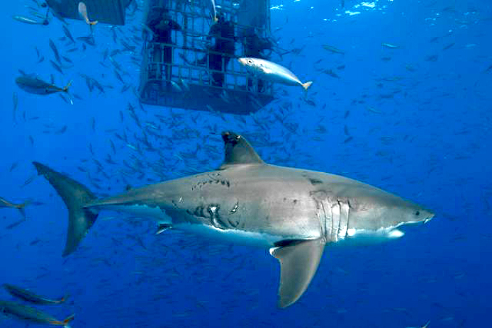 Today was incredible. In the shallow cage I saw three sharks, tuna and a seal diving between everything. Shoals of fish entertain in between great white sharks. And then a huge female with a white scar on her nose swam so close to the cage I was in that I could feel the pressure wave on my face as she shot past. Absolutely wonderful.
