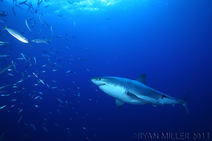 As the first submersible cage ride descended this morning at 0800, I counted 3 individual white sharks before we had reached our target depth, including the infamous Shredder. By the time I had finished my diving for the morning, I had counted at least 8 individual sharks in just over 2 hours of diving! At one point during one of my dives I could see 6 great white sharks surrounding us, all well within 80 ft of the cage. At the forefront of these 6 was a big female, around 17 ft and so big around she looked like she could be pregnant. To add to the surreality of the diving this morning, as if the sheer number of sharks wasn’t enough, we had one of those rare mornings where a huge school of polarized mackerel appeared from the depths of the blue to gather under the hull of the Nautilus Explorer. The school numbered in the thousands I’m sure, and it’s really a spectacular view to see the giant white sharks as they glide through the fish, with the schools parting in perfect unison to form a wide hole for the shark to pass through before closing up again behind the shark. With 6 white sharks cutting randomly through the schooling mackerel the view was incredible. With a beautiful blue background of clear ocean water the scene was complete!