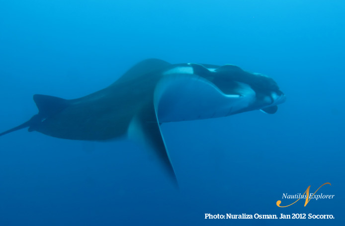 This trip has been absolutely fantastic so far. The crew is phenomenal, extremely personable and attend to our every need. The food is plentiful and fantastic, at every turn we are offered another delicious hot treat from breads to scones to cookies to cakes and then there are great three full meals a day! The passengers are a great eclectic bunch from all over the world including Germany, Finland, Switzerland, and the US. We are having a great time with each other. And oh, yeah, then there is the DIVING! On the second dive at Socorro Island today I was greeted by a curious and friendly manta ray with a 15 foot wingspan!!! The manta kept circling within 2 feet of me, sometimes within inches, and eyeing me. She allowed me to dance with her for 10 minutes, swimming right beside, on top of, and below her wings… It was a quiet and slow tango, and a beautiful personal experience I can’t wait for more. BRING IT ON!