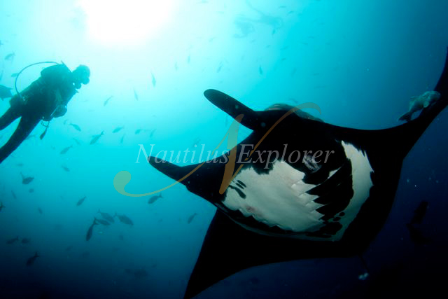 So Bud which has waffled between a Tropical Storm and a Hurricane, became a hurricane but its direction tracked as predicted by Captain Mike towards the Mexican Mainland and we have transitted overnight out to Isla San Benedicto, site of many dives but without question, “The Boiler” is the place to be. It is the Giant Manta capital of the islands and we were richly rewarded for our patience of having to waiting out in the beautiful Sea of Cortez for the passage of the tropical storm. Conditions were such that it was one of those Captain’s Prerogatives, that I needed to check out the conditions for my report, so went for a dive with Beto, one of our Mexican guests from Guadalajara. As we stepped off the back of the dive deck, even for me, my breath was taken away, the water was a deep azul color with crystal clear vis. Laid out before us immediately in full view was the shape, form of the underwater pinacle rising from the deeps to within 10′ of the surface. Below the boat we caught sight of several dolphins just passing through, and fish, tuna and jacks, but there down the length of the boiler was what we sought a Manta soaring around divers who have entered ahead of us. As we slowly came along the face of the rocks we saw more mantas, not one but three more. They stayed and flew by us repeatedly, above us, below us and eyeball to eyeball. It was great. Beto and I then continued around the rock spotting many green morays and more lobster than we could count. We finally came to our ledge where we often see hammerhead sharks coming in just off the sand far below, but today was no joy for the hammerheads. Water temp at depth today was exceptionally chilly for this time of year at 73F or about 21-22C and with vis exceeding 100’/30 metres. Always a great dive but today was special, tonight we will be transitting the 75 Nautical miles to Roca Partida. See what magic it has in store for us this week. Last week we stayed an extra day and were rewarded with a days diving with one whale shark for three out of four dives. Will let you know in a couple of days.