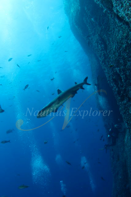Roca Partida: This must be heaven on earth or better heaven in the middle of the ocean. I was just flabbergasted when I dropped down here this morning for the first time. I was pretty tired after waking up loads of times while we went out here during the night and literally had my girlfriend drag me out of bed in the morning, but as soon as I saw what was going on here, I was totally awake. Good visibility, tons of jacks, hunting tuna, white-tips piled up on the balconies in the rock, hammerheads further out and Galapagos sharks, dusky sharks and what not all over the place. Just one word: amazing. This is exactly what I was hoping for when I booked this trip. Everybody was smiling when they came out, shouting and laughing. Some of the guys had a very close encounter with a group of dolphins, the pictures made my heart jump, so I was determined to get see them too. On the next dive, we were lucky enough to come across a mum and her baby and that truly made my girlfriend’s day. She’s actually looking at the picture of the two playing with each other right now. Glad we got another day here, love it to bits. Off to dinner now, I’ll put on so much weight, because the food is amazing too. I guess I will apply for a job in the kitchen.