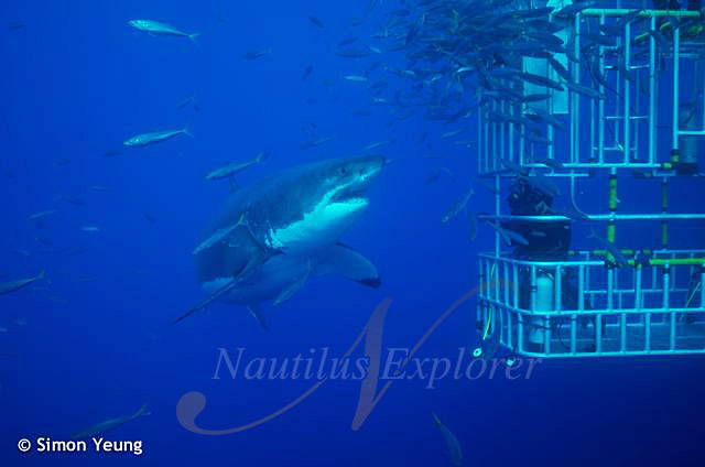 August 5th, 2012: today was a good day. We arrived at Guadalupe Island last night and woke up to the most beautiful panorama this morning. It was going to be my first dive with great whites and it felt like Christmas!!!! The Nautilus crew is very accommodating and they make sure you have everything you need to be safe and have a great time. I dove with Juan, one of the dive masters and he was phenomenal. During this dive, there were 2 great whites in particular that seemed very curious with the strange animals inside the cages and circled around for almost the entire time we were under water. They came as close as physically uncomfortable for some of us, close enough to stare you in the eye with own his dark eyeball. What graceful creatures! They are even more beautiful and fascinating this close up. Anyone out there considering this intimate experience with a great white shark, I can tell you the Nautilus Explorer Crew here with us on this trip are the best!!!! We have a very international visiting crowd from the US, UK, Belgium, Canada and myself from Brazil; everyone looks very excited and pleased.