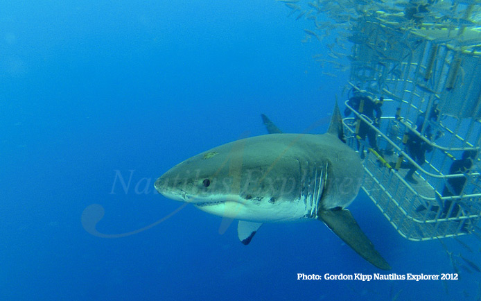Das war der zweite Tag auf Isla Guadalupe. Wir hatten schon ueber zehn verschiedene Weisse Haie ˆalles Maennchen. Die groessten brachten es auf 5m. Nun warten wir auf die Weibchen.