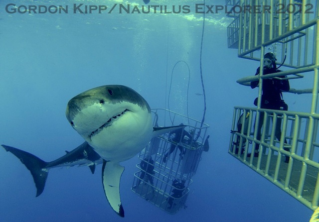 Guadalupe is coated in an eerie looking mist today like when the island first appears in the King Kong movie, only this island’s giants are under the sea. The shark action was thick and fast today well they were a bit reluctant to show up this morning opting instead for highspeed fly bys of the cages which was a nice change, got a real impression for the speed and prowess of these majestic animals. By lunchtime it was business as 3 large sharks in for slow peering cruises past the cages, posing for the cameras focussing on one you would turn to find his buddy grinning behind. All in another awesome day on Guadalupe, hats off to the stars of this show. the Great Whites of Guadalupe.