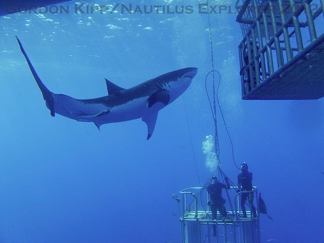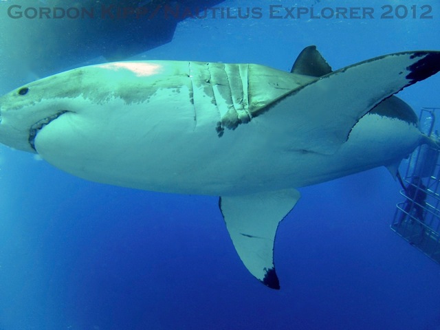 Arrived back to Guadalupe Island last night at 1945 just as it was getting dark, dark. This morning we awoke to a glorius sunrise and clear skies all around the backside of Guadalupe at Shark Bay. To say the diving was good with the white sharks today would be wrong, it was exceptional. All day we had three or four animals and at time as many as five animals in sight. We saw the arrival of the first female sightings with a small female getting really close to a cage in a very relaxed and curious way, wait till you see this photo. No danger to our guests but you can imagine it makes you take a step back when you see the freight train coming and suddenly realize it is not stopping. Vis was also great today. You could watch the shark swim forward around the Nautilus Explorer about 5′ under the surface go around the bow behind the anchor chain and then return down the other side of the boat, back to the cages. From the cages to the bow is about 115 and the shark was well past the chain, so am thinking vis was at least 125-150′ (40-45 M) WOW!!! Temps in the water 70F (20C) and on top upper 70’s (23 ish)
