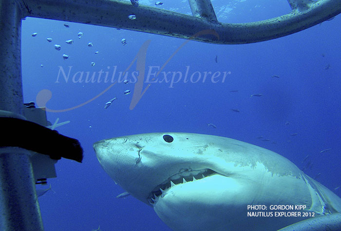 After a very pleasant 185 nautical mile (approx 330km) crossing from Ensenada, Mexico we arrived late last night to the shark lovers paradise island of Guadalupe. Shortly after arrival we had our cages in the calm waters of the sheltered north-east bay and were ready for action at first light this morning. On our first submersible cage dive of the day at 0800 I counted at least 5 individual white sharks circling the two submersible cages. Early on they were keeping their distance, occasionally making a close pass by the cage to check out the humanoids trapped inside. As the day went on they grew bolder and we spent most of the afternoon watching them make fast approaches at us from all depths, above and below, and making tight circles around us with lots of awe-inspiring eye contact. The water was beautiful today with a clear blue 120 ft of visibility and our adopted sealion ‘Toto’ spent a good part of the day with us following, circling and generally antagonizing the whiteys! We couldn’t have asked for a better day to start the trip with and looking forward to more great shark diving tomorrow.