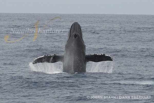 This morning myself and four others, after observing several humpbacks cruising around the Nautilus Explorer, went out whale watching. We cruised towards the shore behind us at Punta Tosca searching for a few of the big guys we had seen flopping around on the surface. As we approached a group of three, they suddenly decided they were no longer interested in sticking around on the surface so they sounded and were gone. The whale watchers and I floated around for a few moments when a few more Humpbacks surfaced behind us. We turned and raced towards them but they too decided they had somewhere else to be. It was, to be honest, a little frustrating as there were whales EVERYWHERE but we just were not getting lucky enough to drop in the water with them for a quick snorkel. We decided to head towards the dive site and see if we could track down the huge group of the whales that we had seen earlier in the morning. This group of whales was 6 or 7 in total. I have never seen so many Humpbacks all swimming around together! It was like watching a small island plough through the water when they all came up for breaths together. Sure enough when we got close to the dive site, BOOM! Whales everywhere. They were cruising around just back and forth and I managed to sneak in beside them and the snorkelers jumped on in. They all got a good look at these massive creatures from the water and so did I from the skiff. A few cheers and hi fives later and we took off after them again, and again we got into the water with them! This time a few dolphins were riding the whales bow wake. Yes there were enough of the whales together that they were creating a bow wake. After that we decided it was enough and started heading back to the Nautilus. As we turned around and headed back, the whales turned too and we just had to go for it again! Third time in was the best. The snorkelers had to stop swimming and back up or they would have been ran over! 4 or 5 whales right in front of them and one dove right below them. They could have reached out and touched them! Woooo