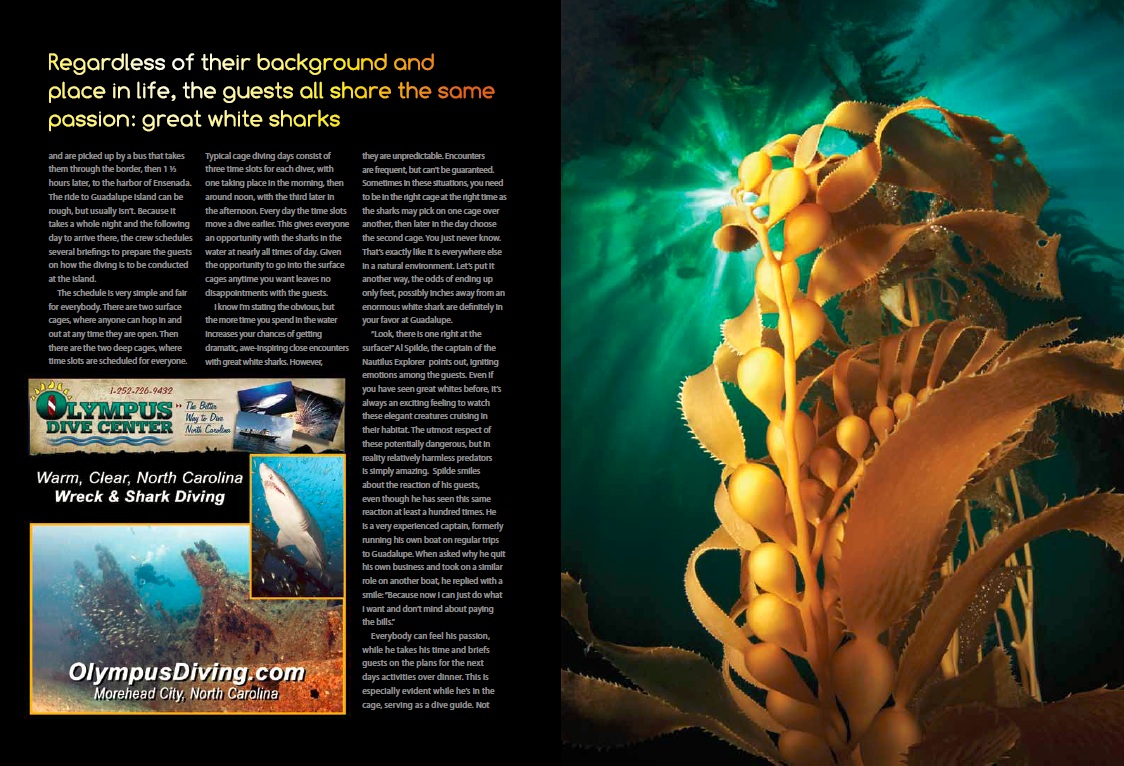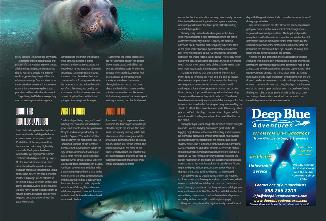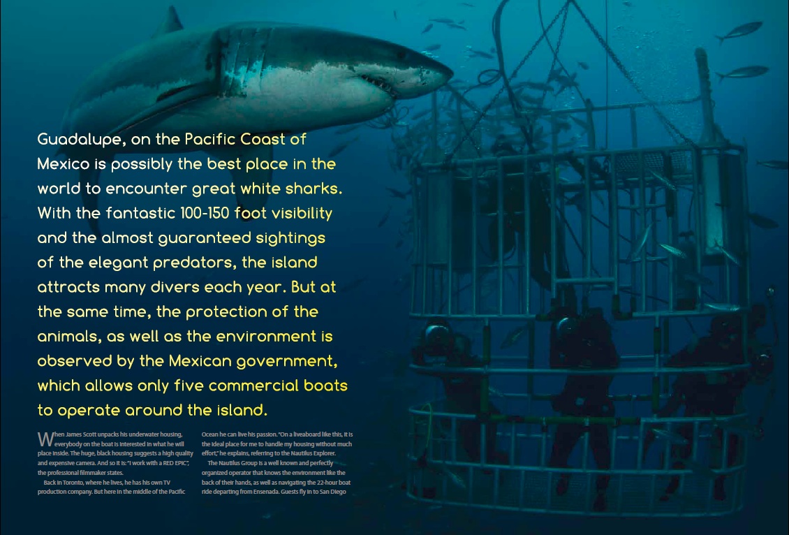 Guadalupe Great time, Great moments, Great white Sharks Post author By Nautilus Staff Categories Archive, Guadalupe Post date 2013-04-05 No Comments on Guadalupe Great time, Great moments, Great white Sharks Take a look at this amazing spread about Guadalupe and the great white sharks by Tobias Freidrich. Tags great white sharks By Nautilus Staff Updates, exciting information and other news from the staff at Nautilus Liveaboards. View Archive → Leave a Reply Cancel replyYour email address will not be published. Required fields are marked *Comment * Name * Email * Website Save my name, email, and website in this browser for the next time I comment.