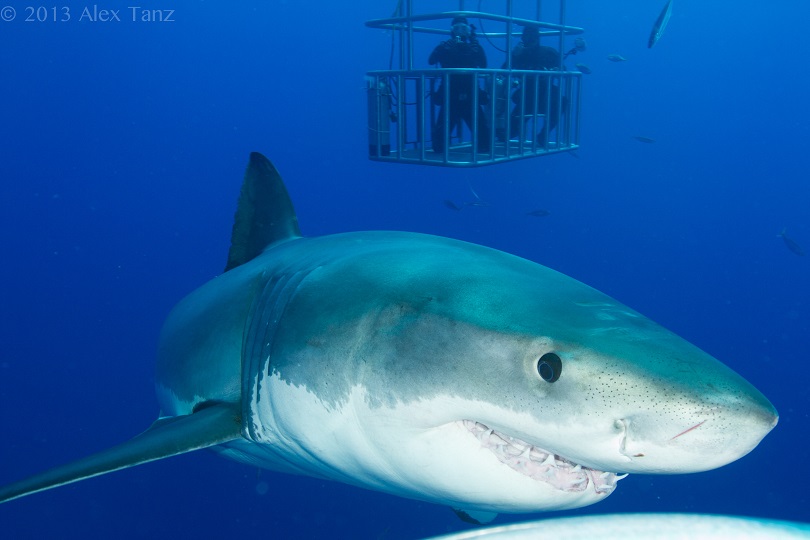 First day after a rough 20 hour boat ride from Ensenada to Guadalupe. Many of the passengers fell ill with seasickness as the boat made its way. After a good nights rest I woke up to the cherry pickers dropping the cages in the cobalt blue water. We descended 30 ft down in the cages. As I panned the scene I spotted the first Great White coming toward the cage to investigate its new neighbors. Within minutes we had been greeted by two more! I‚d like to think they swam by us with reciprocated wonder. They got so close you could even see their eyes move and the sinew caught in their teeth! Some of my fellow divers were fortunate enough to get a cage bump and the captain of the ship came within a foot of a large male.