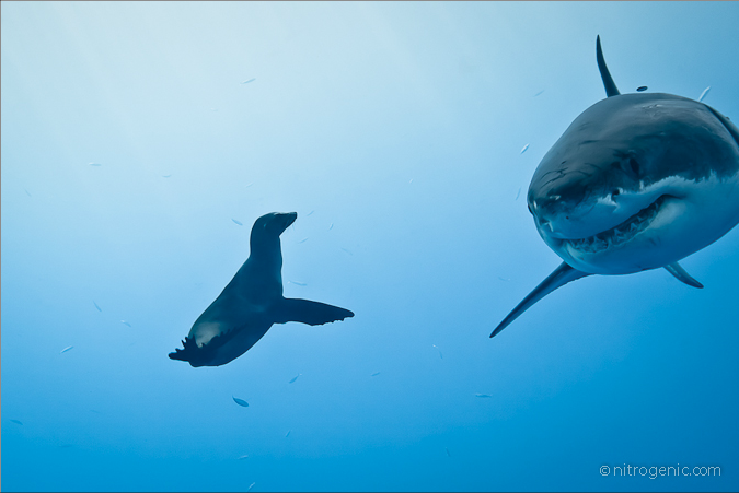 Here I am back on the Nautilus Explorer heading back to Ensenada. The second day was great with the whites, we had 5 sharks together at one time. We just were about to swing our heads off as we try to focus on one shark than another shark would just pop up three feet away and another one behind me. It was a moment of catch me if you can. The vis was about 120 ft plus I could see the anchor chain and also I could see the greats just approaching in the distance. I could hardly make them out but I just kept looking out and all of a sudden I could start to see the shape and the monster just heading towards us. The weather has been really nice just like a lake behind a mountain. The last day we had pretty good action, we saw some tuna circling around and a sea lion just playing with the great whites I was like buddy I don’t want to be in your shoe . So far everyone enjoy there trip and left with a smile and great me memories . Well hope to you all soon for an adventure of a life time .
