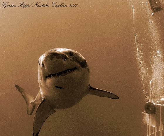 I never would have imagined that 15 years later I would be Captain of a liveaboard vessel exploring the waters surrounding the strip of land that had always had that pull on me. I must have known something after all, because it really is a magical place. Today we got to show our group of 24 guests visiting us from Russia a little taste of that magic on the first dive day of this expedition. We woke up to a gorgeous sunrise with clear skies and calm, blue water in the sheltered anchorage of northeast Guadalupe. The view is spectacular, with the ocean meeting rugged, sheer cliffs full of pock marks and colorful layers from it’s volcanic origins. Although our morning was beautiful, it started off very slow in the cages. We did have one young white shark at the surface for a couple of minutes before we started our submersible dives, but after that we had nothing but one brief sighting from afar. Then after lunch everything changed when a huge 6 meter female great white shark showed up. A big female like this is the real deal, dominating the ocean, moving with the grace and confidence of knowing who is in charge. After hundreds of hours in the water with these animals, I still get so excited when I see a big dominant shark like that show up. It’s humbling and awe inspiring and adrenaline inducing all at the same time. This big girl stayed with us all afternoon, circling the submersible cages and the surface cages repeatedly, close enough to touch on many occasions, even after the last person got out of the water. We also had a smaller male white shark around for much of the afternoon who kept a respectful distance. Our guests finished up with a cold beer in the hot tub as the sun set over the island.