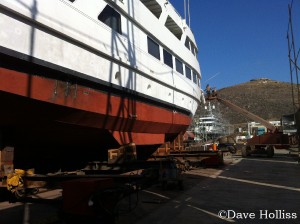 Refit is always a very satisfying time. It is a proud and awesome feeling when the Nautilus Explorer emerges from refit looking beautiful with shiny new paint. In this pic, our crew are hard at work getting the exterior of the ship ready for painting. The image reminded me of a dentist scraping away at me teeth and getting ready to do some serious polishing. The NEX will be glistening a week from now. Captain Mike.