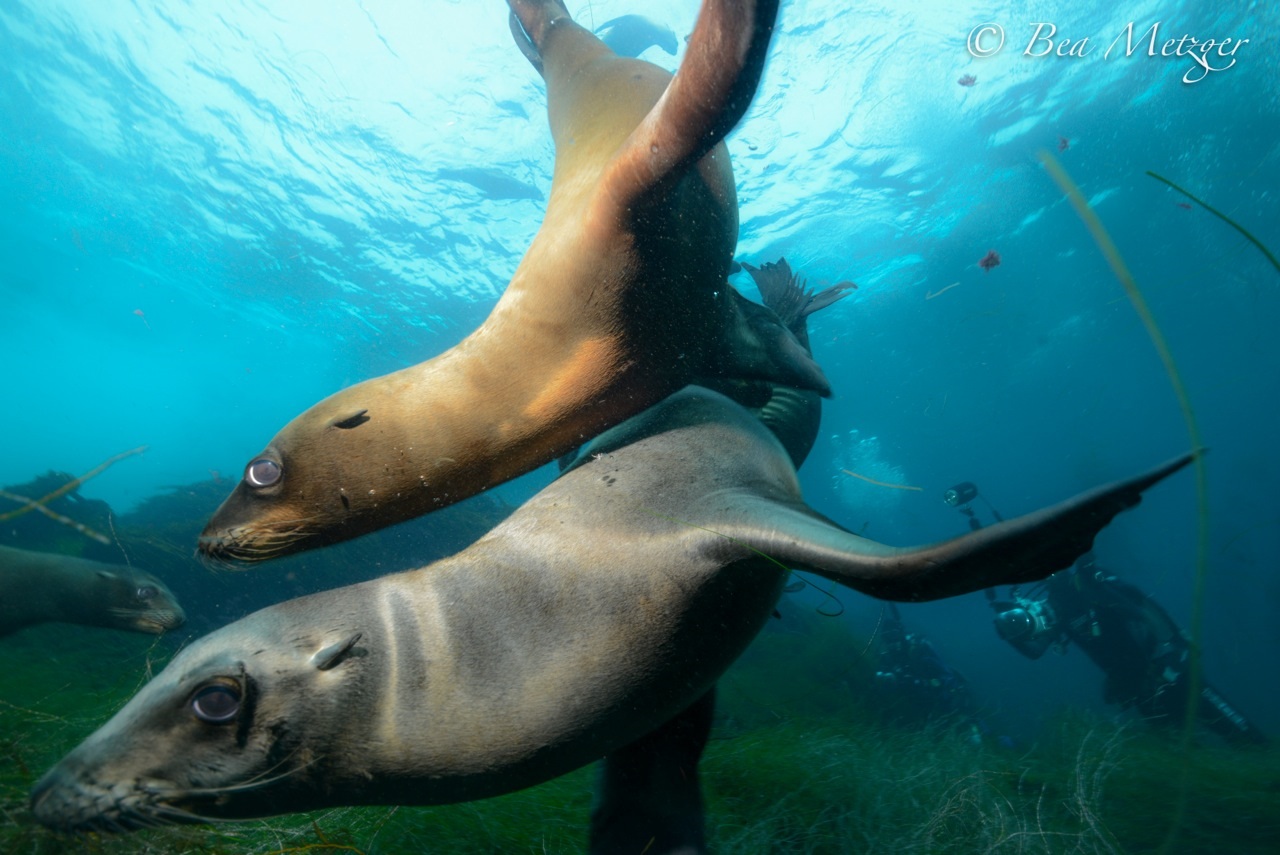 This is what happened today as we crept towards a beach on the east side of Cedros Island. Myself and a couple other guests laid still in the sea grass (roughly about 15ft of water above us) snapping shots of the odd sea lion that came in from the beach to cool down, this is when we were discovered by the kids…. Out of no where a fury of sea lion pups bombed down onto us from every direction as if each one was wanting to be the first one to check us out. At first I didn’t know which way to point my GoPro, one by one they would come right up to the lens for a sniff. We all figured this dive could last 2-3 hours with out getting boring while laying around in this frenzy. Just another wild day off the west coast of the Baja.-DM Jesse