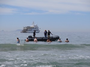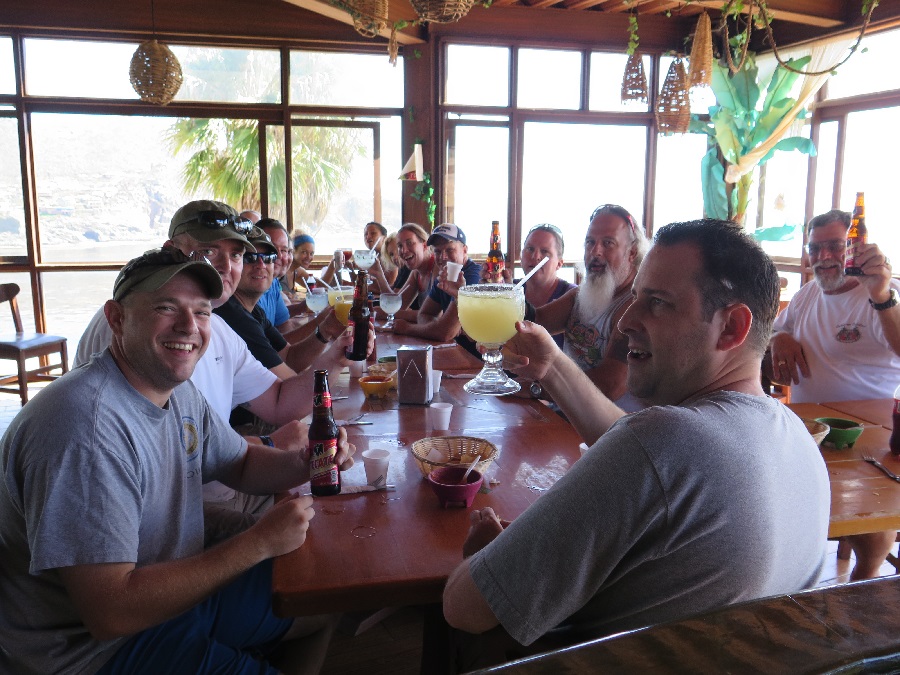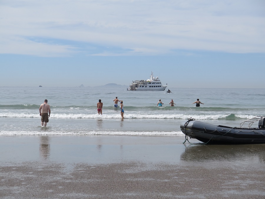 After deploying our zodiacs we went and checked it all out, jumping into the 6 foot waves that were crashing into shore turned a few of the guests into kids. After a couple hours of soaking up the sun it was time to head back to dry off and have a couple drinks. While guests did that it was time for us Divemasters to get back in the water, but not for an everyday reason. It was time to buff the props until they are squeaky clean and brilliantly shiny and clean off any growth on the hull they had collected from the ocean. We even had deckhand Danny join us in the routine matience that I know myself and the others would much rather do in Ensenada rather than the great White shark infested waters of Guadalupe. Clean props = more speed to get to our little gem, Isla Guadalupe! Captain Mike wants us to make every possible speed advantage enroute once the tropical storm has passed through. Props cleaned, sun setting, time for cocktail hour. -DM Jesse