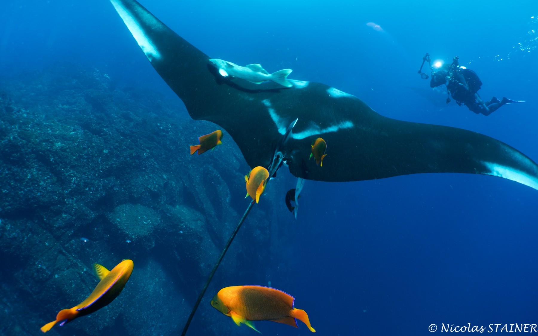 While traversing an underwater mountain top ridge, all of a sudden a strong current whisked us forward, and when we regained our stability, a GIANT Manta, with a massive wingspan, was creeping up behind us. It was almost as though the Manta was causing the strong current with its giant wings. It continued to hover among us, letting us peer into its strange and beautiful world.