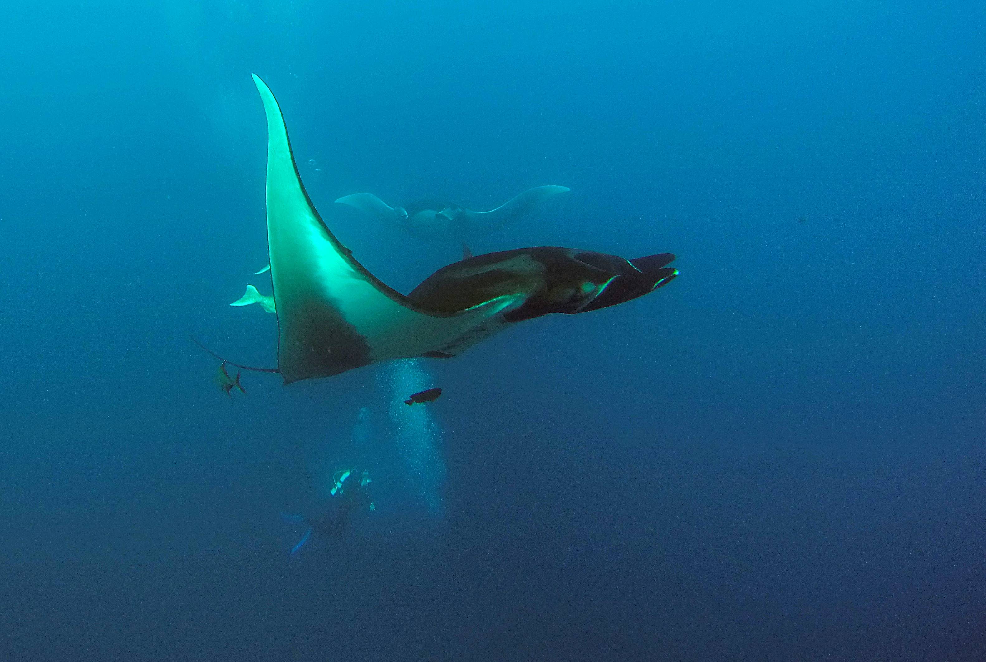 The sun is shining and the swell has dropped out for a beautiful day topside. The diving has been solid, with several friendly mantas around this morning. Also spotted a few big galapagos sharks and hunting yellow-fin tuna.