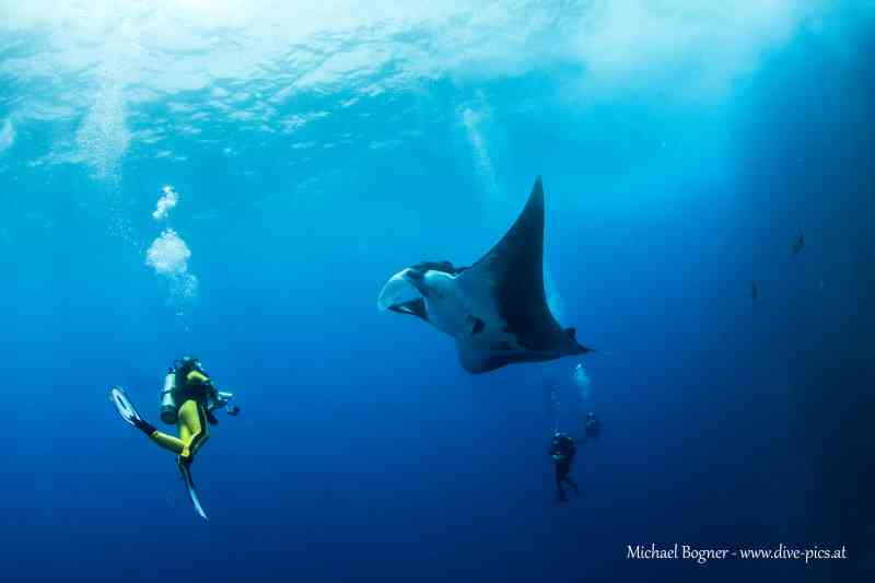 The 1st dive of the day was tough, a little current combined with surge makes for a lot of kicking. Thankfully the 2nd dive was a lot better, the current changed direction and slowed down, and we didn’t have to swim as much because we had 3 beautiful, friendly mantas swooping in and out of the group. We know we shouldn’t touch the mantas but they make it difficult by swimming so close to the divers, they actually bump into us, providing for some great close up shots. The hammerheads have been really shy today but lets see what the 3rd dive brings.