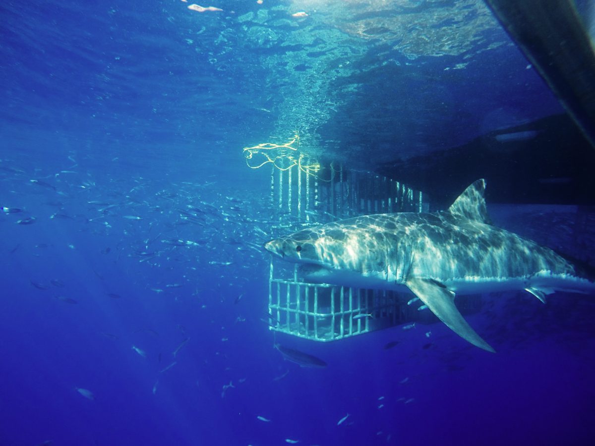Today we had some truly amazing dives! The Guadalupe great whites were very active the whole day. At least 5 at the same time and a sea lion among them that was visiting our cages. We could identify “Ropey,” “Mau,” “Hunter,” “Rhet,” and our favorite shark, “Kenric” (with his pilot fish of course).