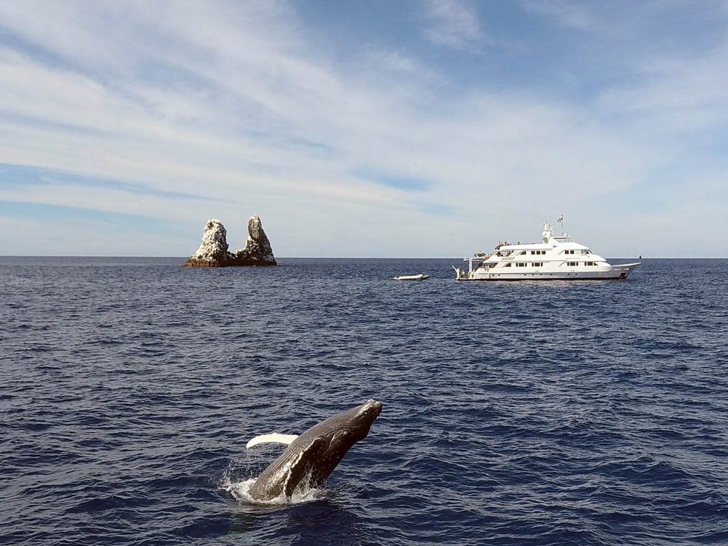 Mid-January to mid-April is the absolute peak season for humpback whales at Socorro. The government of Mexico no longer allows us to put snorkelers in the water with whales. But it’s no problem and a great gift if a humpback whale swims by during a dive. You will hear them singing during your dives. If you are in a lower deck stateroom on one of our ships, you might hear them singing as you lay in bed at night, and you are sure to see whales on the surface. And with our decades of experience in these islands, we have a couple of secret spots to anchor to maximize the chances of the whales swimming right past the back of your boat.