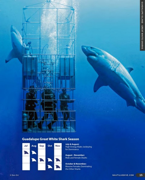 July & August; GUADALUPE ISLAND - GREAT WHITE SHARKS High-Energy Males Jockeying for Dominance August - November; Male and Female Sharks October & November; Massive Females Dominating the Other Sharks © Dan Orr NAUTILUSDIVE.COM 15