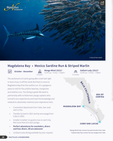 • Limited scuba diving available by prior request. 2 Gallant lady trips connect by sea voyage from Cabo