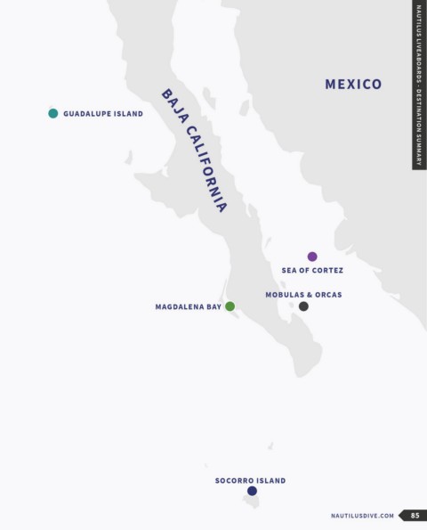USA MEXICO NAUTILUS LIVEABOARDS - DESTINATION SUMMARY GUADALUPE ISLAND BAJA CALIFOR N I A SEA OF CORTEZ MOBULAS & ORCAS MAGDALENA BAY SOCORRO ISLAND NAUTILUSDIVE.COM 85