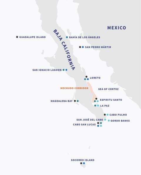 USA MEXICO GUADALUPE ISLAND BAHÍA DE LOS ÁNGELES SAN PEDRO MÁRTIR BAJA CALIFOR N I A SAN IGNACIO LAGOON LORETO MECHUDO CORRIDOR SEA OF CORTEZ MAGDALENA BAY ESPIRITU SANTO LA PAZ CABO PULMO SAN JOSÉ DEL CABO GORDO BANKS CABO SAN LUCAS SOCORRO ISLAND