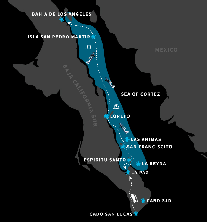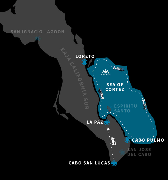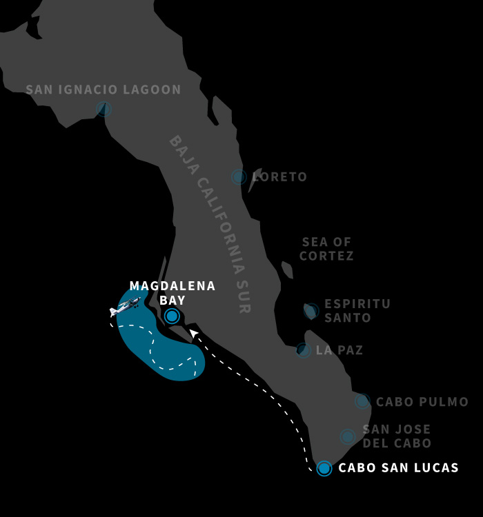The great whales come home to Baja every winter, giving us a plethora of experiences and adventures. Our ultimate whale trips combine our observation airplane, swimming with whale sharks, snorkelling with sea lions, and spending 3 nights on your own 116-ft expedition yacht, immersed in the beauty of the Sea of Cortez and its abundant wildlife, including blue whales, humpback whale mommas and babies, fin whales, and pods of dolphins. The adventure continues with a private sightseeing flight across Baja to our luxury camp at San Ignacio Lagoon with the most extraordinary whale interaction on the planet. This is an unforgettable 8 day / 7 night adventure and a tremendous value.