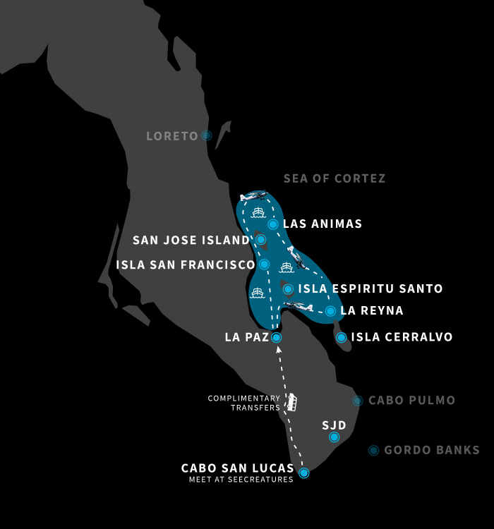 Loreto is the most beautiful place in Baja with the stunning Sierra La Gigantic mountains, gorgeous white sand beaches, and, in summer and fall, crystal-clear aqua-blue water. The sunrises a sunsets have to be seen to be believed, and the diving is pretty darn good too. Our 7 night expeditions combine the famous and classic dive sites north of La Pa, including La Reyna, Espíritu Santo, El Bajo, San Franciscito, and Las Ánimas—with a combination of Coronada, Danzante, and possibly Carmen islands in the Loreto National Park.