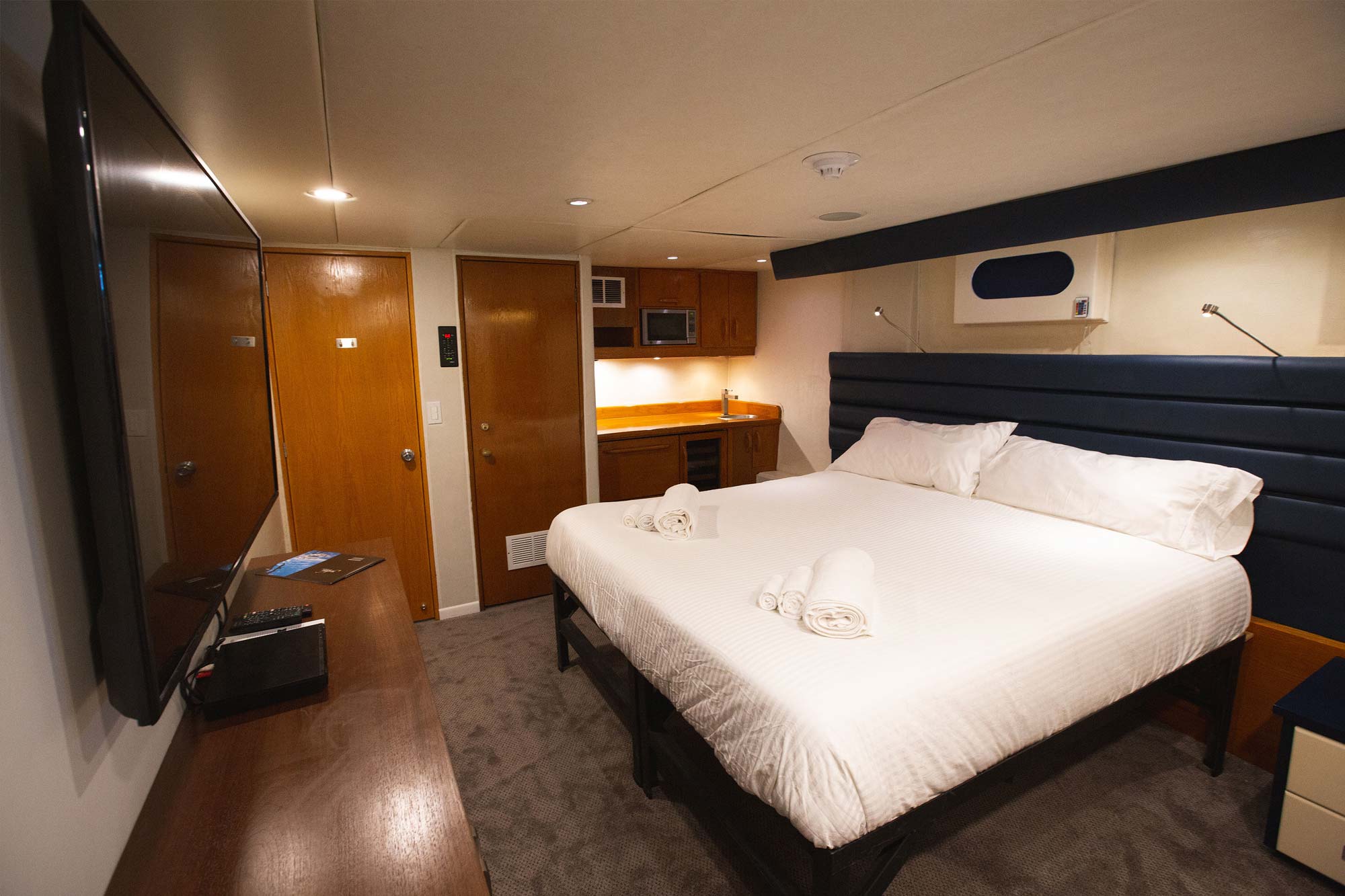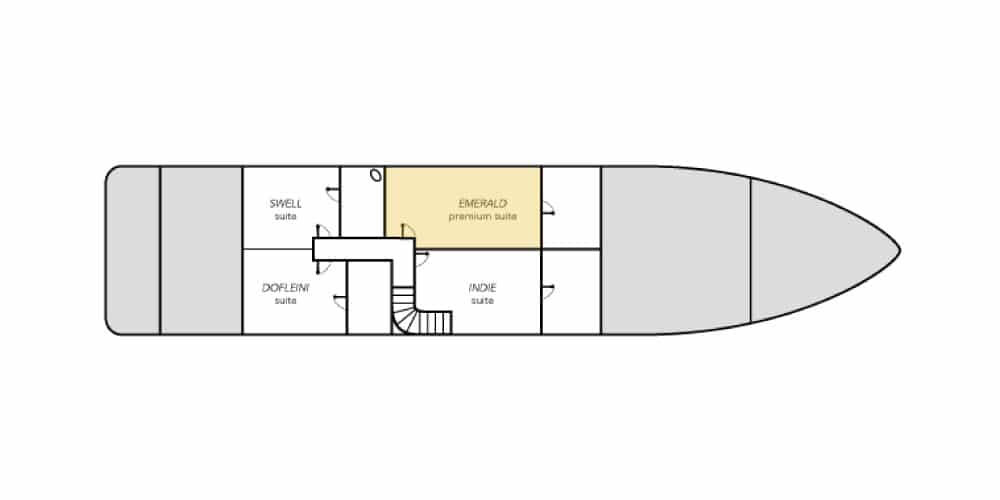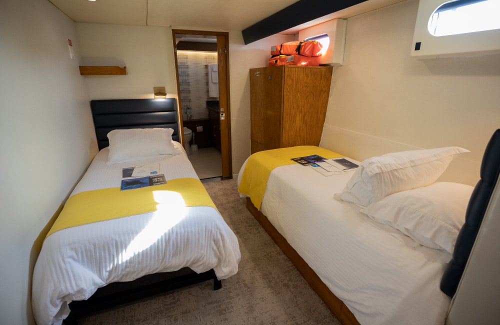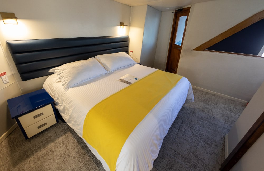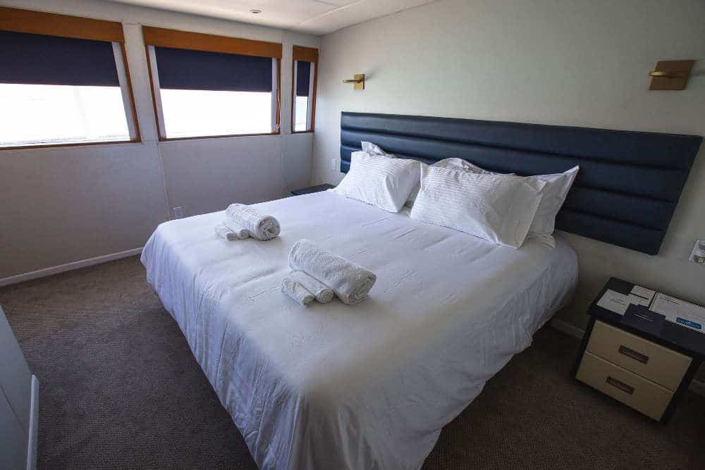 Our spacious premium suite is on the lower deck and can be configured with either a California king bed or 2 doubles. It has its own private ensuite bathroom and shower (Emerald).