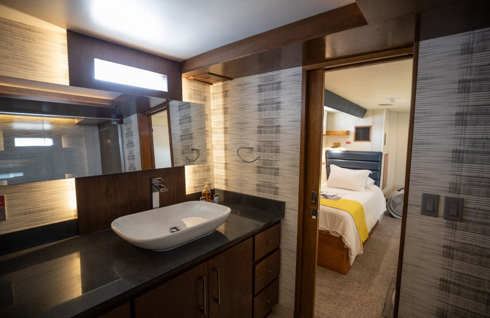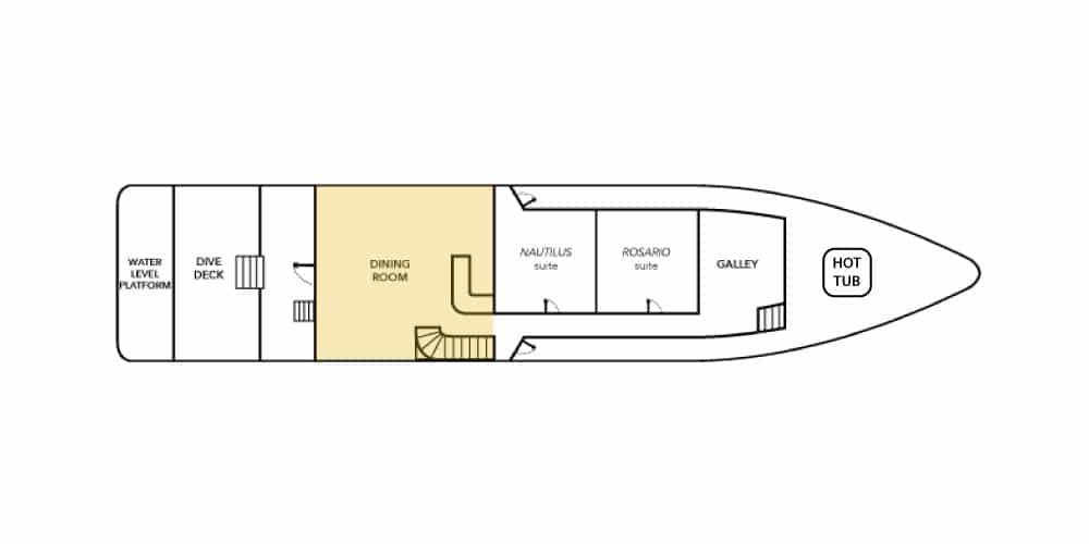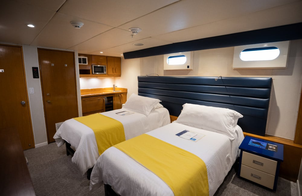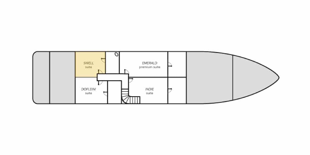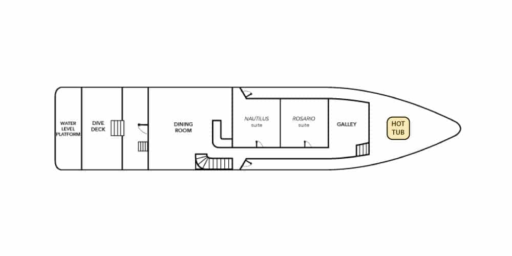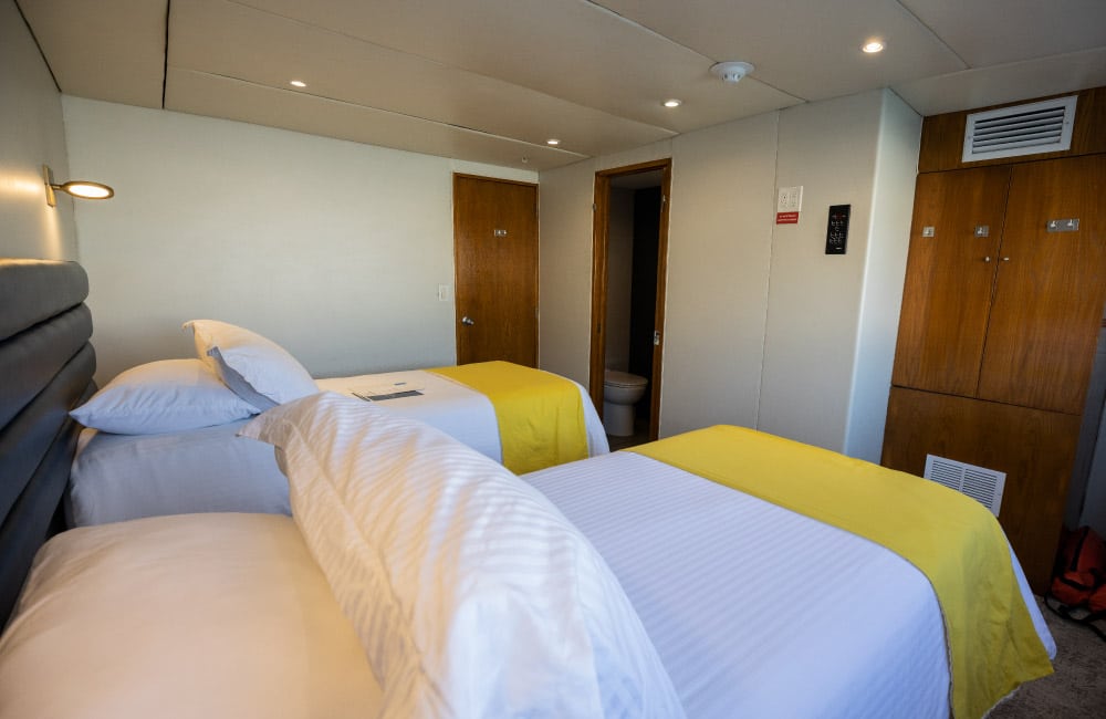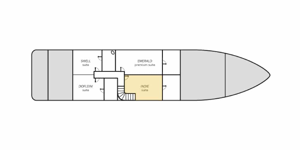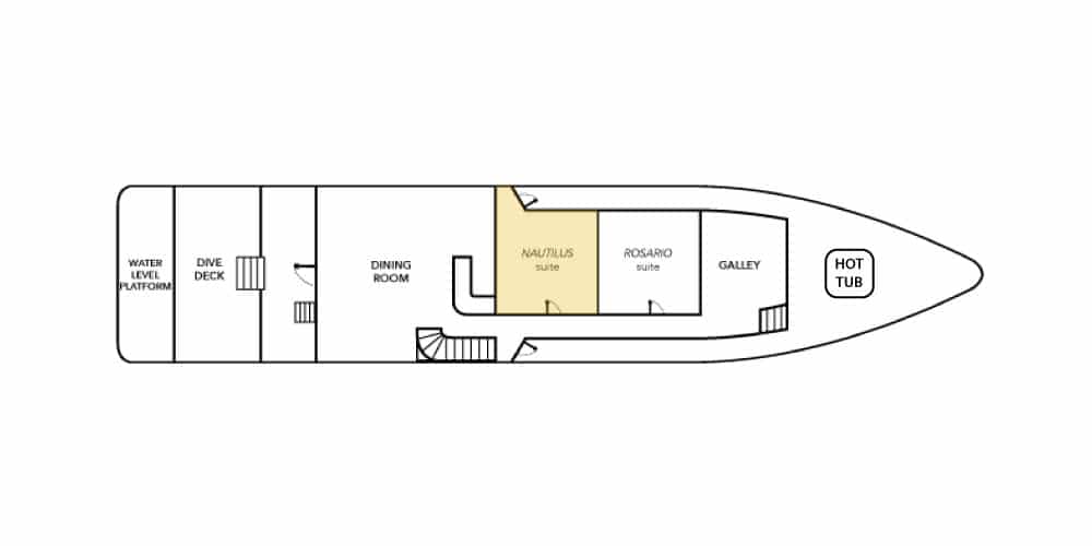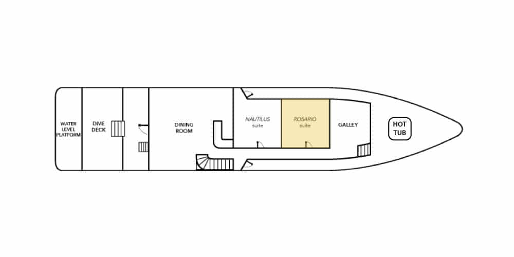 2 superior suites are located on the main deck and 3 are located on the lower deck. 4 of them can be configured with either a California king bed or 2 doubles. All suites have individually controlled A/C, as well as an ensuite bathroom and shower (Inde, Dofleini, Rosario, Nautilus & Swell).