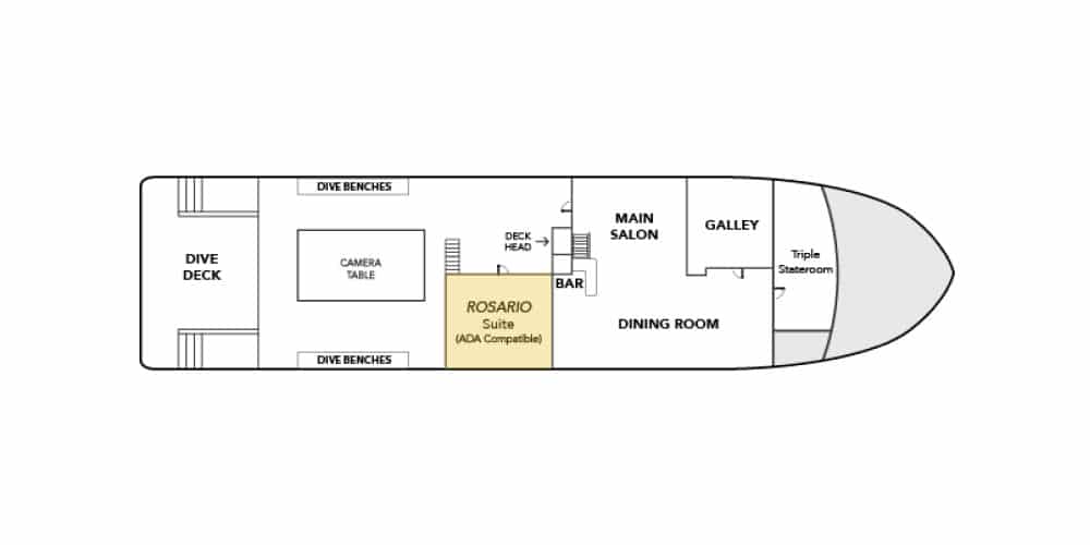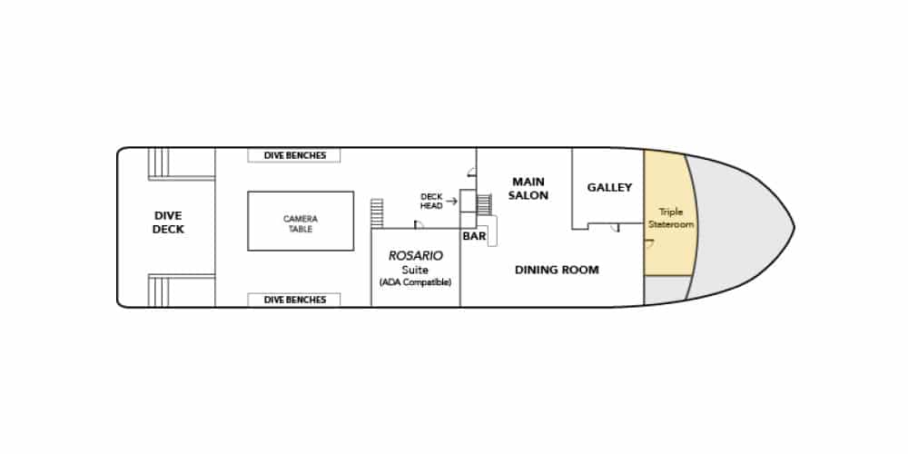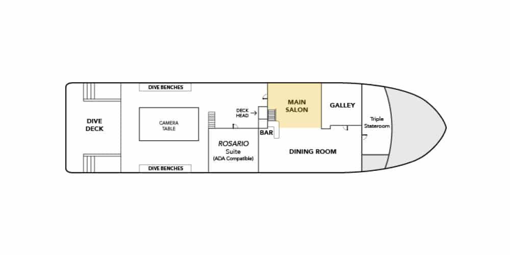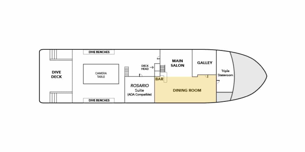 Main lounge and dining room, dive deck, water level platform, ADA compatible stateroom, and triple stateroom.