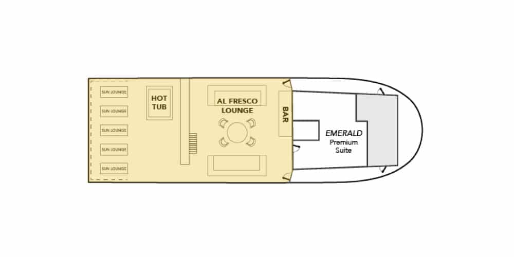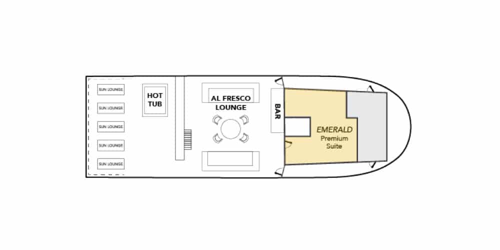 A large premium suite on the sun deck can be configured into two full beds or one large bed. Flat screen TV, multiple windows, ensuite, plenty of storage space, individually-controlled air conditioning and easy access to the hot tub (Emerald).