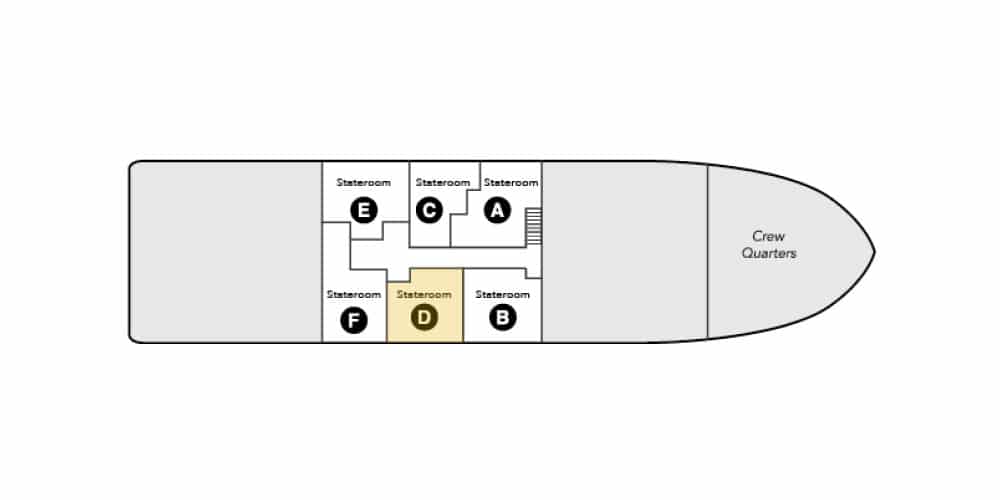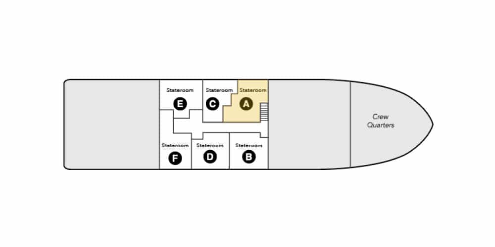 Lower deck. Upper and lower beds. Configuration varies between the 6 staterooms. Ensuites with private showers and individually-controlled air conditioning (A,B,C,D,E & F).