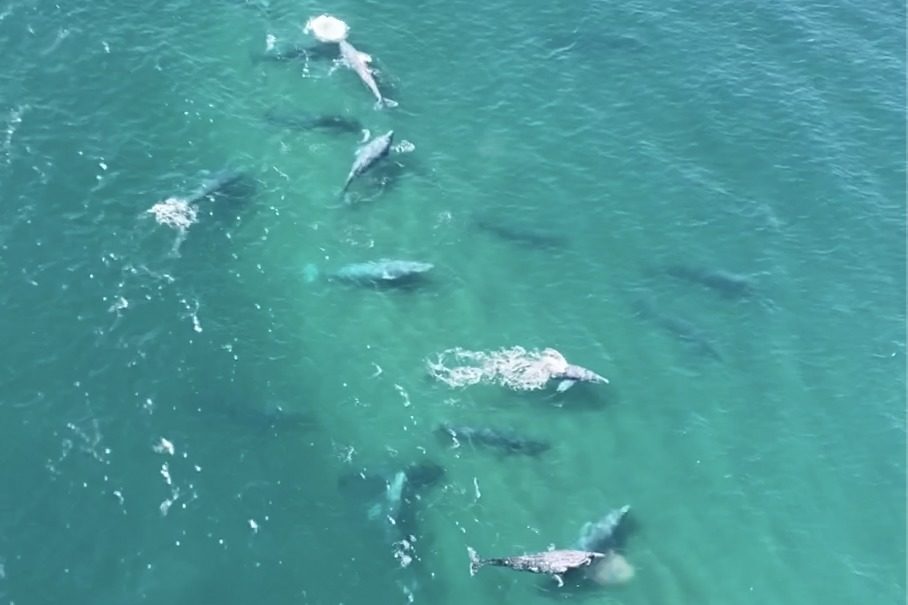A gray school of whales gathering outside the entrance to the lagoon, waiting and taking turns to ride the surf in is crazy.